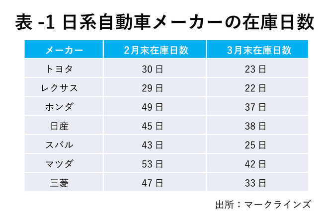 3月末の在庫日数を見ると、日本メーカーの在庫は押しなべて減少している。ブランド別の2月末と3月末の在庫日数は表-1の通りだ。4月の販売台数も日産を除き伸びている。昨年同期比でトヨタ10.2%増、ホンダ18.1%増、日産2.1%減、スバル0.3%増、マツダ21%増だ。
