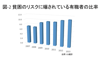 組合が特に問題としているのは、図‐2の通り、働く人たちが貧困のリスクに曝される比率が上昇していることだ。その理由は幾つかある。最低賃金の凍結・引き下げ、公務員給与の凍結・引き下げなど、賃金下落の圧力につながる政策がギリシャ、ベルギー、ポルトガルなど多くの国で実施されたことが影響している。
