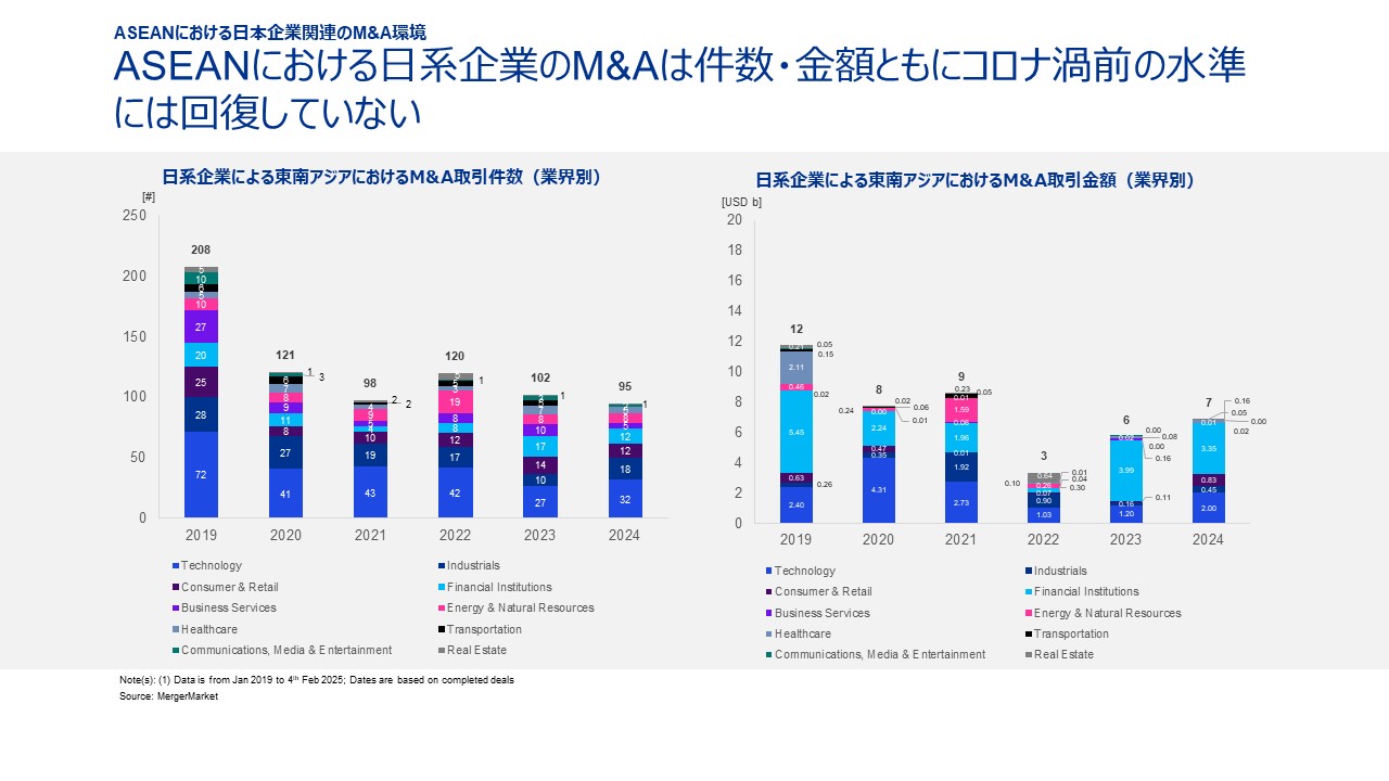 先ほど日本企業のM&A件数が過去最高と述べたが、実はASEANでは様子が違う。下のグラフが示す通り、ASEAN全体における日系企業のM&A件数は、コロナ前の2019年をピークに、現在もそれよりはるかに低い水準で推移しているのである。しかし各企業のM&Aアペタイトが下がっているかというと、そうではない。私がクライアントを訪問してニーズを聞くに、以前にも増してM&Aニーズへのサポート要請を受けるのが現状だ。