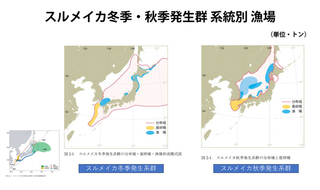 下図は、スルメイカが冬生まれと秋生まれの2つの資源に分かれていることを示しています。左下の図の冬季発生群をみると、日本の南の海域で生まれたスルメイカは日本海と太平洋の双方に分かれて回遊するようですが、秋季発生群は主に日本海を北上しているようです。
