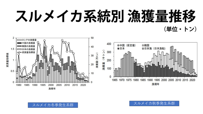 もちろん、南で生まれたスルメイカは回遊して北上します。しかしながら、漁獲量減少の原因は、黒潮大蛇行の有無ではなく、スルメイカの資源量全体が減ってしまったためと分析するのが妥当ではないでしょうか?