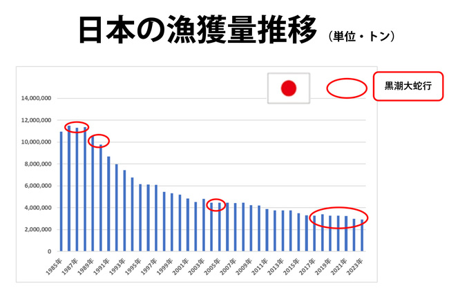 あと、もう一つ大きな問題があります。仮に黒潮大蛇行の解消で、一部の海域などで資源が回復するようなケースはあるかもしれません。しかしながら、もし一時的に回復するように見えることがあったとしても、資源管理制度の不備ですぐにまた獲り尽くしてしまう漁獲圧が働いてしまいます。これが問題の本質なのです。