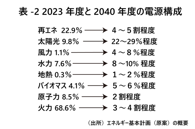 今年2月に閣議決定された第7次エネルギー基本計画は、50年脱炭素を目指し、再エネ設備の発電量の大幅増を想定している(表-2)。