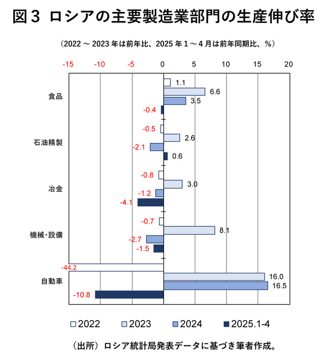 図3では、製造業の重要部門を選び、その生産動向を示している。やはり、早くも24年には落ち込んだり、25年に入って数字が悪化したりしている部門が目立つ。主要部門のパフォーマンスがこれだけ冴えないのに、「ロシアの製造業が好調」と言うのは無理があるだろう。