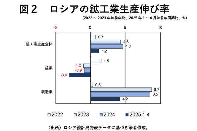 それが、22年2月のウクライナへの全面侵攻開始後は、本来の花形である鉱業が不振に陥り、代わって製造業が主役に躍り出ている。図2に示されているように、鉱業は資源価格が高かった22年こそプラスだったが、その後は価格が落ち着き、また対ロシア制裁が本格化するにつれ、減産に陥っていった。
