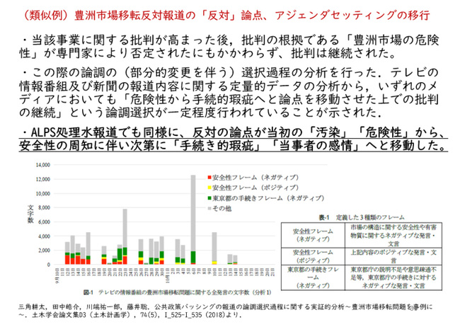 科学的安全性が社会に広まった後も、海洋放出反対運動の論点は「汚染」「危険性」から、「人々の不安」「合意形成の不備」などにシフトしていった。こうした「恣意的な社会問題化」「反対論点の移行」はALPS処理水海洋放出問題以前に起きた豊洲新市場問題でも共通している。