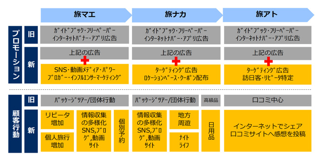 下記の図は筆者監修で2019年に出版した『インバウンド・ビジネス戦略』(日本経済新聞)に載せたツーリズム生態系におけるICT基板、今で言うDXの図で、旧来とデジタル化の元での新たなツーリズムビジネスの生態系を比較している。旅ナカの顧客行動は別途詳細に記述する必要があるが、この図は全体像をつかんでもらうために簡略化している。観光DXでは、本来この旧来プロセスをただ新しいデジタルに載せるだけではなく、ビジネスモデル自体も個社と業界と地域レベルで変革していく必要がある。