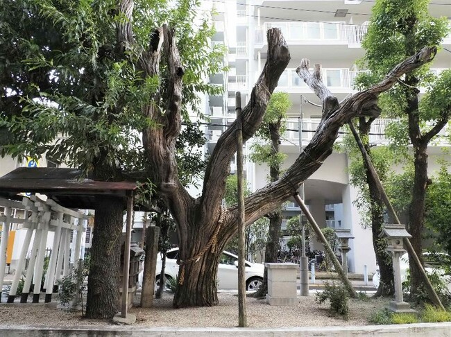 「そして今なお残っているのは、日本人の樹木に対する感覚、自然観の表れも関係しているのではないでしょうか。戦災樹木の大半は神社仏閣にあります。昔からご神木として畏れられてきた木は、たとえ無残な姿でも伐採されずに残された。その象徴とも言えるのが、枯死したまま道路のど真ん中に堂々と立つ『楠木大神』です。大阪市中央区谷町にあるこのクスノキは1945年3月13日から翌日未明にかけて大阪空襲(第一次空襲)で被災しましたが、戦後の道路拡張工事でも撤去されずに残っています」