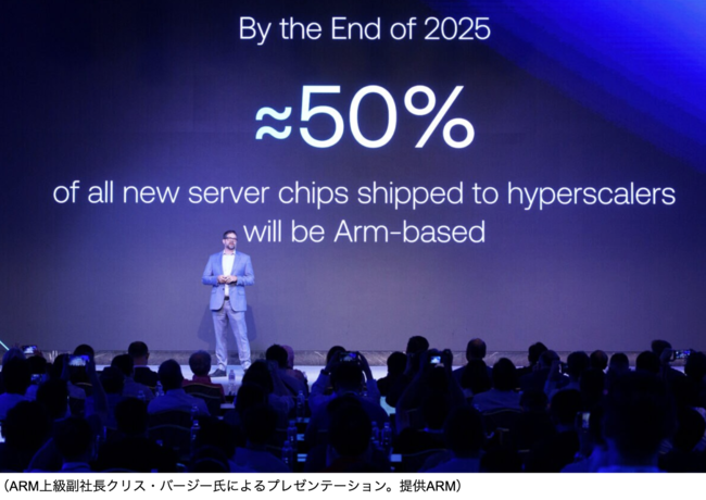 そのARMアーキテクチャが現在目指すのはAI時代に適応したスパコンやPC用CPU、自動運転用プロセッサなどで、その業績はAIブームもあって飛躍的に伸びている。同社上級副社長、クリス・バージー氏が5月に開催されたComputex Taipeiでのイベント発表によると、ARM製の新型サーバーチップは2025年末までに全体の5割に迫る勢いだという。