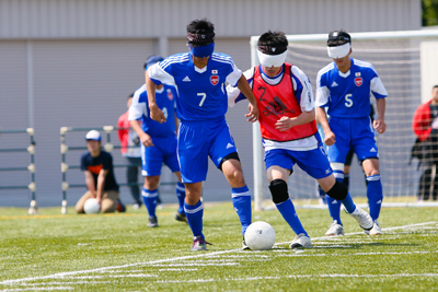 アイマスクをつけて行う、ブラインドサッカーとは…(提供:日本ブラインドサッカー協会、以下プレー中の写真は同)