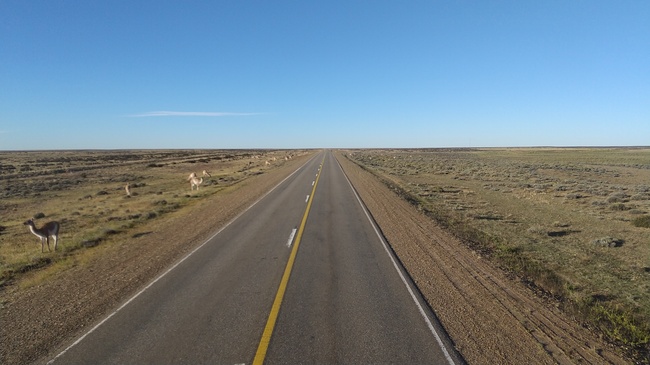 ところがコロラド川を渡り、しばらくしてパタゴニア北部に入ると、荒れ地に灌木や茨が生えているような景観に変わってくる。そして不思議なことにバスが疾走する幹線道路の脇には、道路と並行して、木杭に有刺鉄線を張っただけの簡単な柵が、延々と設けられている。荒涼とした大地にも所有者がいるようだ。たまに羊の群れが見える。放牧されているのだろう。