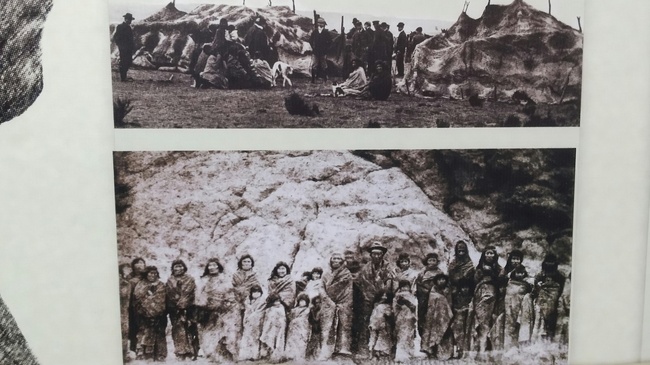 歴史博物館では、19世紀中葉に撮影された写真で、パタゴニア先住民の日常生活が紹介されていた。当時パタゴニア南部の海岸地帯では、先住民は1家族か、2家族単位でカヌーにより、季節ごとに移動しながら、漁業・狩猟・木の実の採取をして暮らしていたようだ。毛皮の衣服を身に着け、毛皮を張り合わせたテントで寝起きしていた。