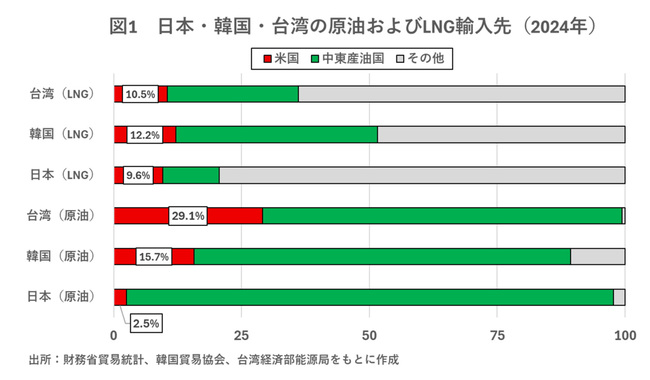 たとえば、日本と同じく、エネルギー源の大半を海外から輸入している韓国の場合、原油輸入に占める米国の割合が17年の1%から24年に15.7%まで上昇した結果、中東依存度が24年に約7割まで低下した(図1)。また、台湾でも同期間、米国産原油の輸入量が258万バレル(総輸入量の0.8%)から8300万バレル(29.1%)に増加し、中東産の輸入抑制に寄与した。