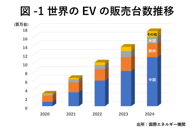 世界のEVの24年末の累積台数は5800万台、世界の自動車台数の4%に達した。中でも、中国は世界の新車EV販売台数の6割以上を占める大EV市場になった(図-1)。