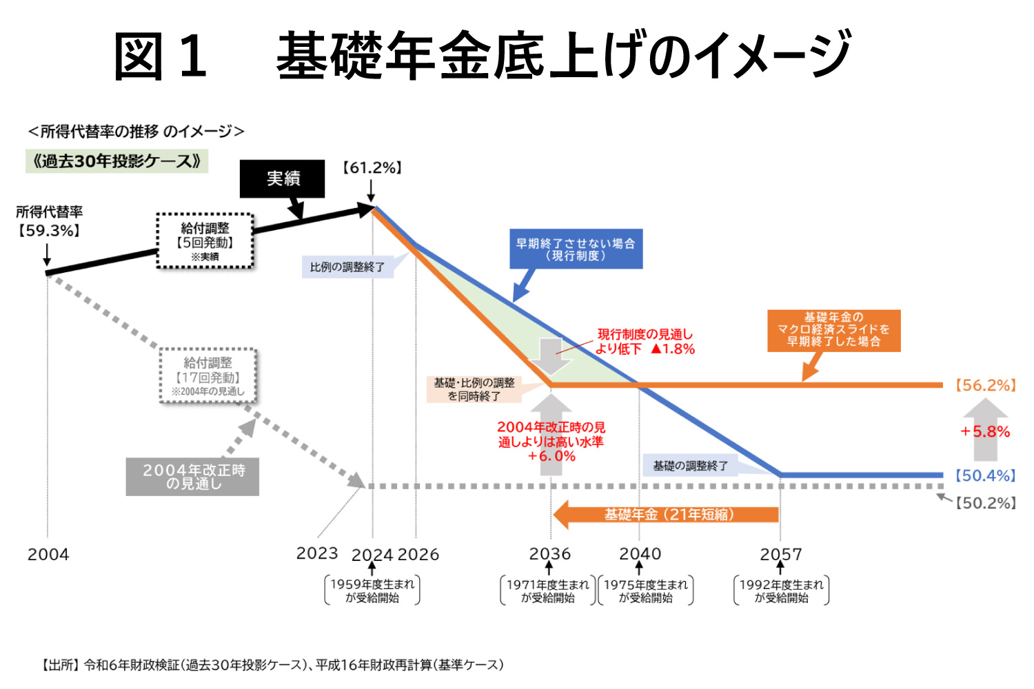 基礎年金底上げとは、財源が厳しい基礎年金を比較的安定している厚生年金の積立金によって引き上げようとするものである。厚生年金の報酬比例部分において、本来であれば年金額の伸びを物価や賃金の伸び率に比べて低くおさえるマクロ経済スライドが2026年度に終了予定であったが、36年度まで適用延長することで厚生年金を減額して基礎年金の増額に振り替える。また、厚生年金の積立金を基礎年金給付財源として流用する財政措置を行うことで、基礎年金のマクロ経済スライドの適用期間を短縮するものである。