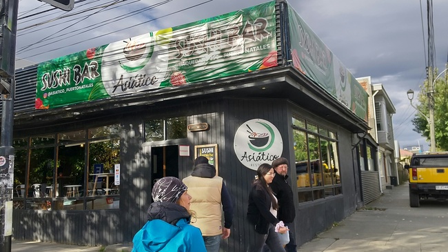 2月28日。プエルト・ナタレスのメインストリートの端に“アジア人”(Asiatico)というレストランがあった。看板にはスシとセビーチェが並んでいた。セビーチェは代表的ペルー料理で生の魚介類のマリネである。“アルゼンチン・チリでの見聞から判断すると少なくとも両国では“スシ”は海苔巻き(現地ではテマキとも表記される。いわゆる巻き物)を意味している。