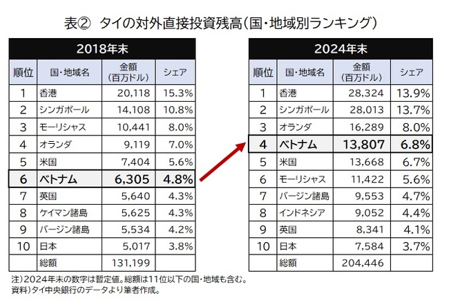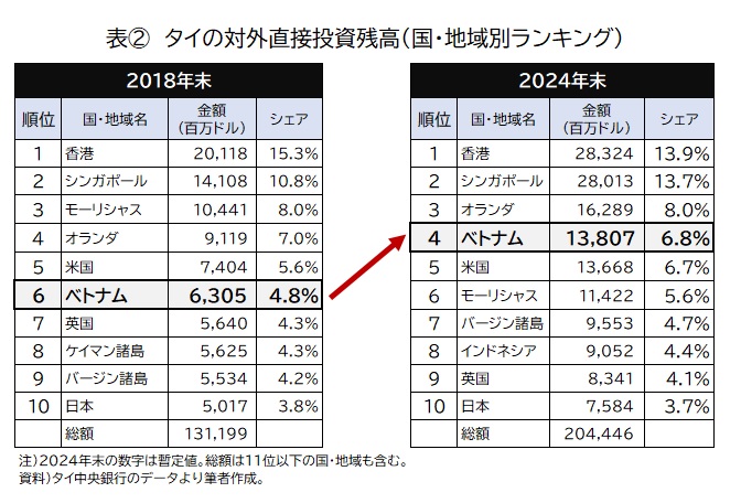 タイ中央銀行の統計によると、タイ企業の対ベトナム投資残高は2024年末時点で約138億ドルに達した。ベトナムは国別4位、全体に占めるシェアは約7%だ。金額・シェアともに過去最高水準に上昇している(表②)。