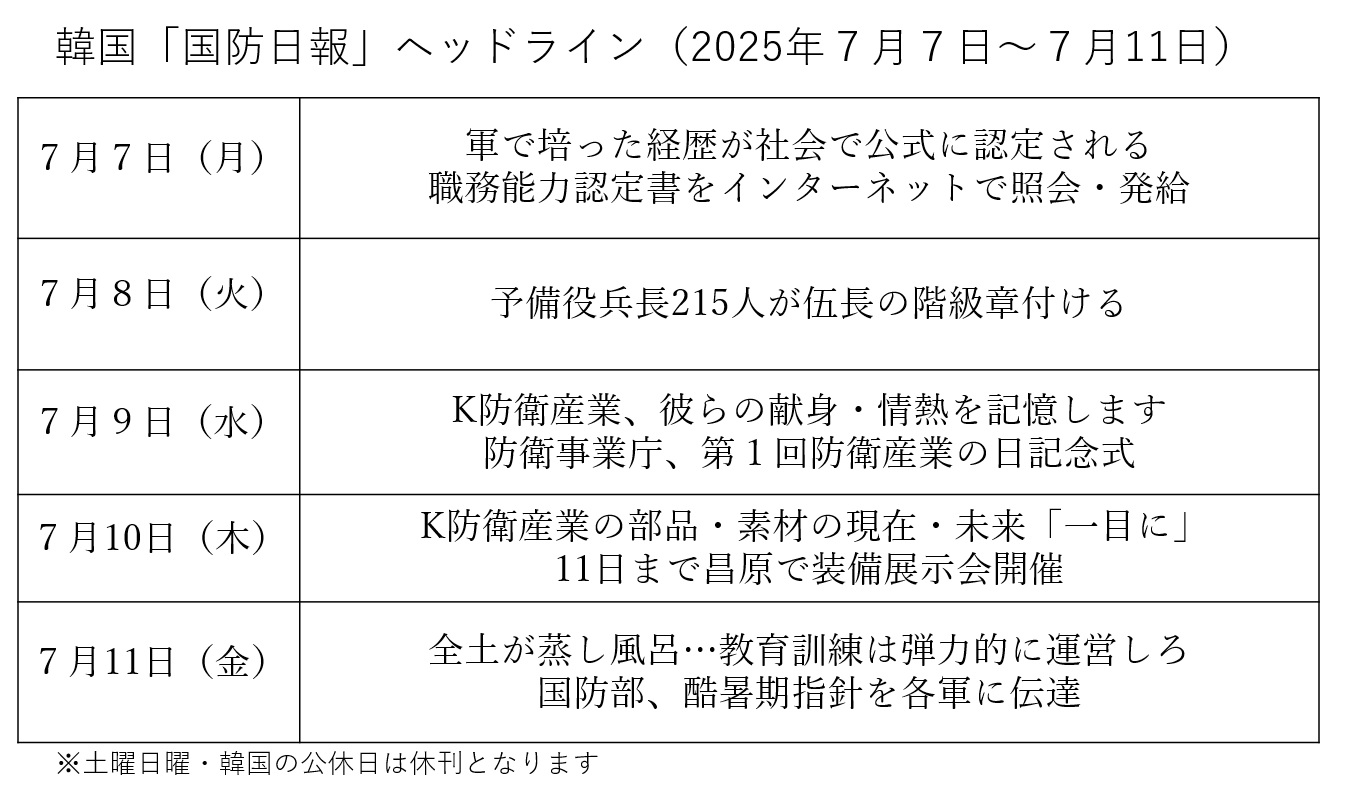 7月9、10日と「防衛産業の日」に関するヘッドラインが続いた。防衛産業の日とは、防衛産業の重要性を国民に知らせ、防衛産業従事者の誇りを高めるために制定された記念日のこと。尹錫悦政権下の2023年、防衛産業発展法の改正で毎年7月8日を防衛産業の日とすることが定められ、今年が初の施行となった。