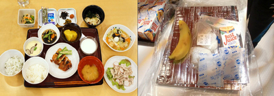 図5(左)ロンドン五輪の時にマルチサポート・ハウスで出されたリカバリーミールの一例。バランスよく、多くの品目がある図6(右)同じくロンドンで出されたリカバリーボックス。おにぎり、バナナ、野菜ジュースがある(写真:亀井明子さん提供)