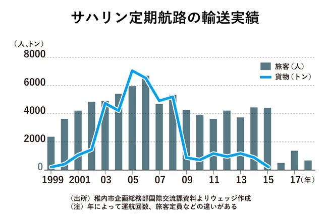 利尻島・礼文島へのフェリーを運航している「ハートランドフェリー」は、1999年から2015年度までサハリンへの定期航路を運航しており、稚内とコルサコフ間を約5時間30分で結んだ。最盛期の06年には日本人とロシア人などをあわせて約6000人が乗船し、多くの人々が往来した。