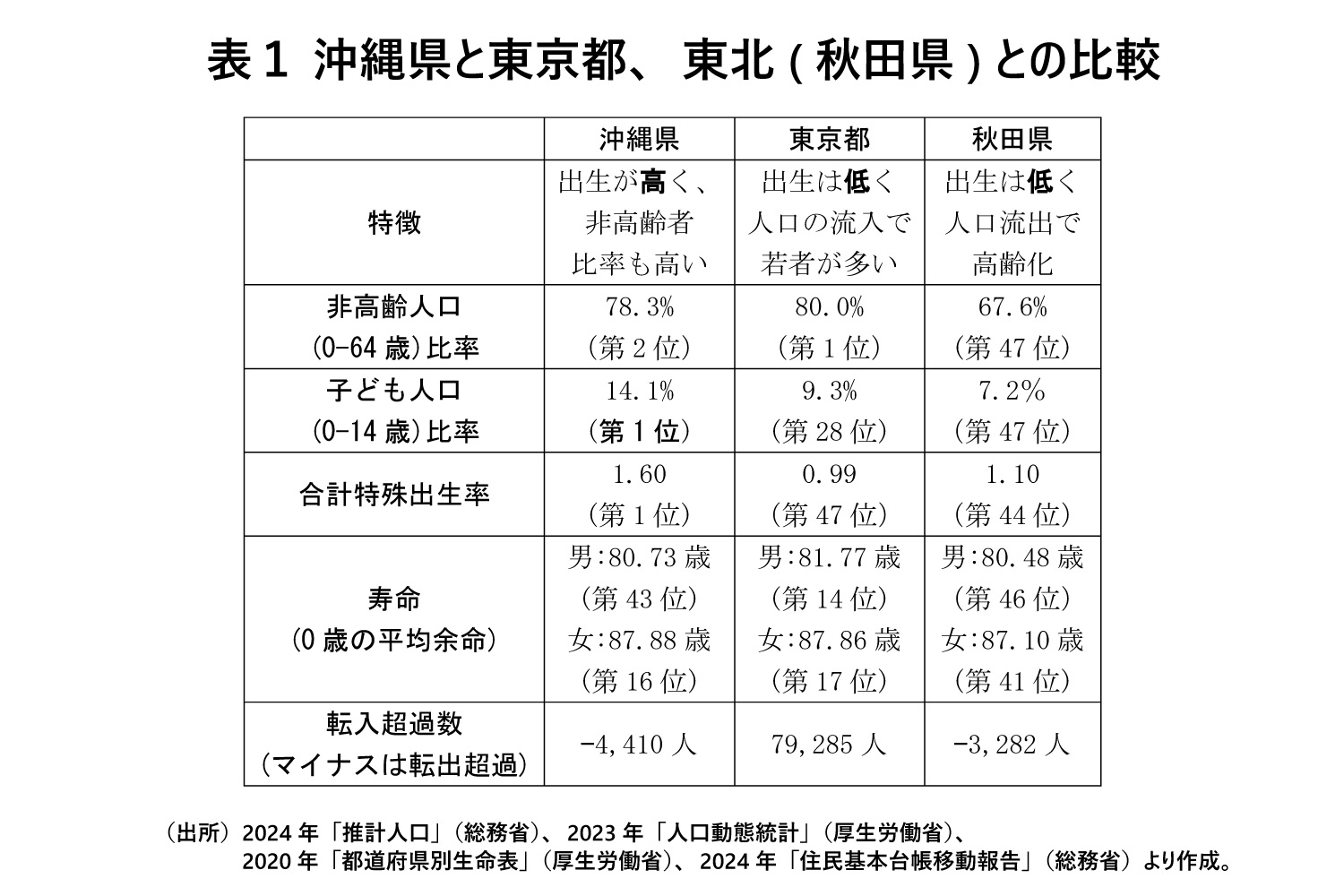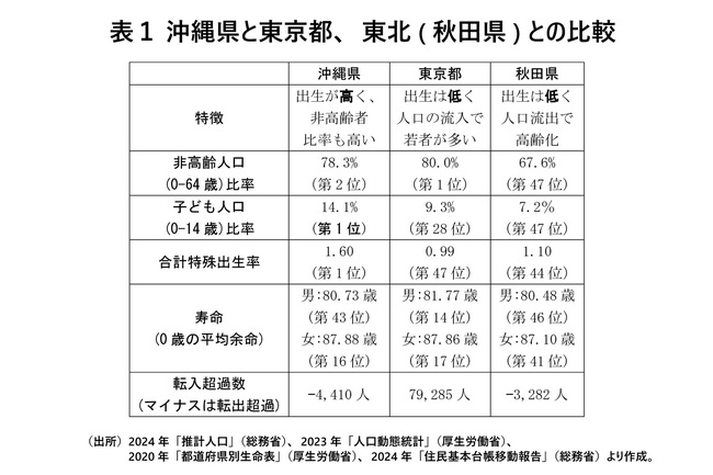 今述べた若者(0~64歳の非高齢者)の比率は、全国平均が74.9%であるのに対してトップの東京都が80.0%、2位の沖縄県が78.3%と共に高い数字であるが、その内容は異なる。東京都は出生率が低いために、全国から若者を集めて成り立っているのに対し、沖縄県は出生率そのものが高いために若者が多いといえる。実際、若者の範囲を0~14歳の子ども人口に限定すると沖縄県は全国1位である。