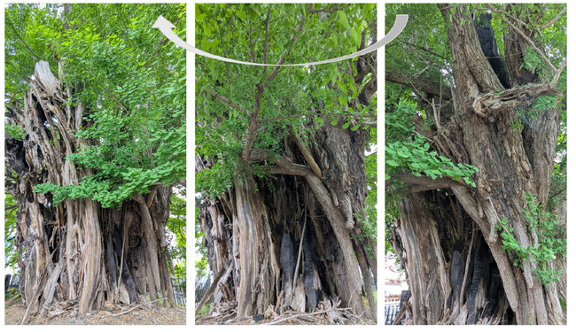 石碑のハリスが向く方に、その木はあった。駅からの道中、目印にした緑の茂みは一塊の大樹だったのだ。カメラのフレームどころか、視界にも収まらない。圧倒的な存在感に、思わず声が漏れた。