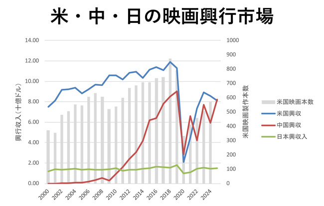 かたや中国では、25年公開の『ナタ 魔童の大暴れ(魔童鬧海)』が興行収入21億ドル(約3000億円)を突破した。世界の映画興行史において歴代5位、『アバター』(09年、29億ドル)、『アベンジャーズ/エンドゲーム』(19年、27億ドル)、『アバター2』(22年、23億ドル)、タイタニック(97年、22億ドル)に続く快挙であり、10億ドル以上のメガヒットになった歴代50作ほどは「すべてハリウッド作品」という米国が寡占する世界映画市場のなかで、「唯一の外国産メガヒット作」である。
