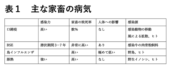 主な家畜の病気を見ると、手ごわそうな感染症が並んでいる(表1)。