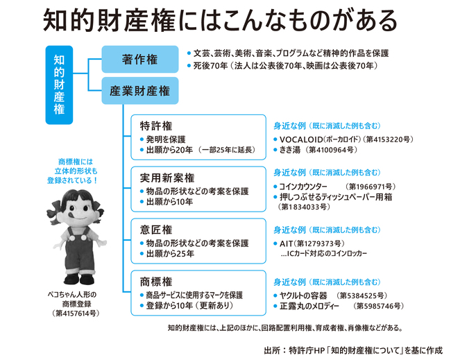 さらに、ホンダのスーパーカブや、不二家のペコちゃんには、商標権があります。このように知的財産が守られることによって、創作者は安心して創作に取り組むことができ、ヒット商品が生まれるのです。