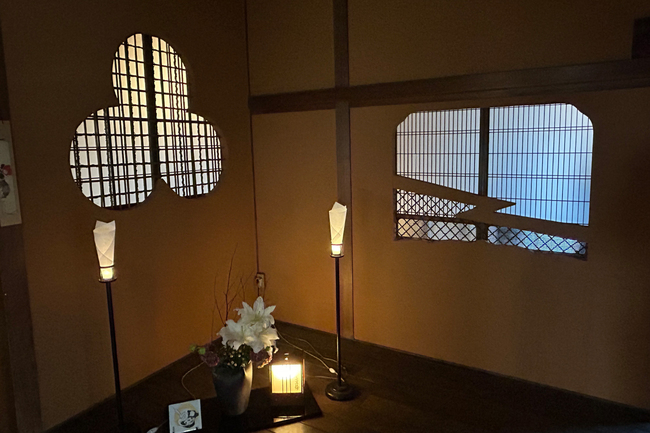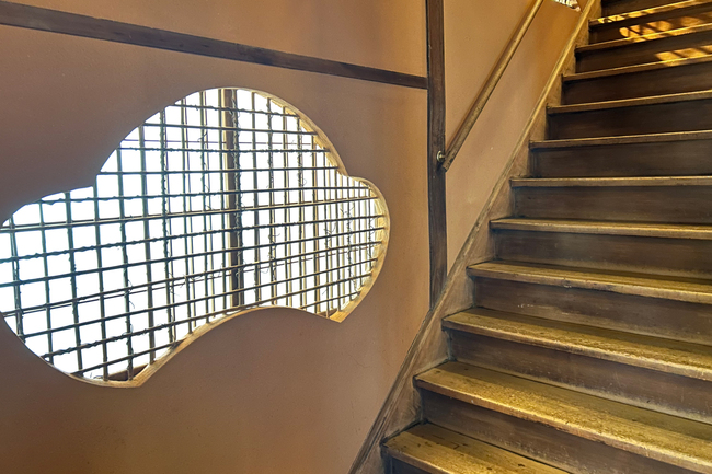 石段を上がって玄関を入ると、まず目につくのがたくさんの下地窓だ。それぞれ意匠が異なり、例えば2階への階段脇には松、雲、山をモチーフに3つの窓が切られ、上がった正面には月が待ち構える。全館で40カ所、すべて異なる高度な装飾が施され、まさに祇園の粋が写し取られているかのようだ。