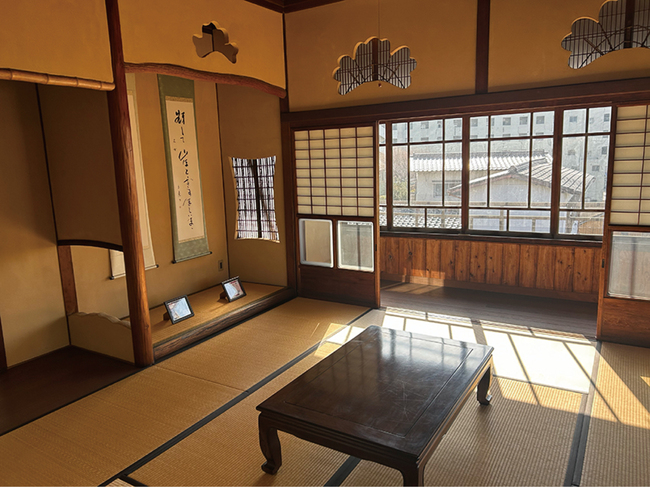 佐三が大人数の宴席に用いたのが2階の「百畳間」である。60畳を超える広さに、港を見下ろす縁側が回されている大広間、特筆すべきは16畳もの舞台だろう。折り上げ格天井に、欄間が設けられるほどの奥行きがあり、踊りや演能に用いられた。料亭で能を演じるのは極めて珍しい。アサは芸事へのこだわりが強く、京都から師匠を招いて芸妓を仕込んだ。客にも粋人や文化人が多く、3階には佐三が好んだ部屋や俳人・高浜虚子に愛された部屋もあった。
