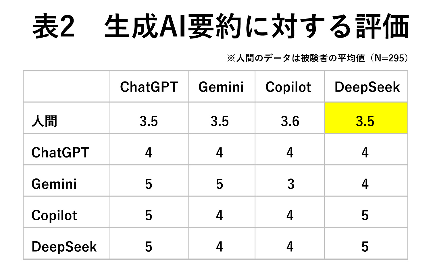 実際、これらの生成AIの要約はどう解釈されるだろうか。今回、オンラインモニターに各AI要約を読んでもらい、内容の信用度を1:信用できない~5:信用できるまでの5段階で評価してもらった。加えて、AI同士でもまったく同じことを行い、その結果をまとめてみた(表2)。ちなみに、評価の際には、「どのAIが生成した要約」であるか、AI名を示した上で評価してもらった。