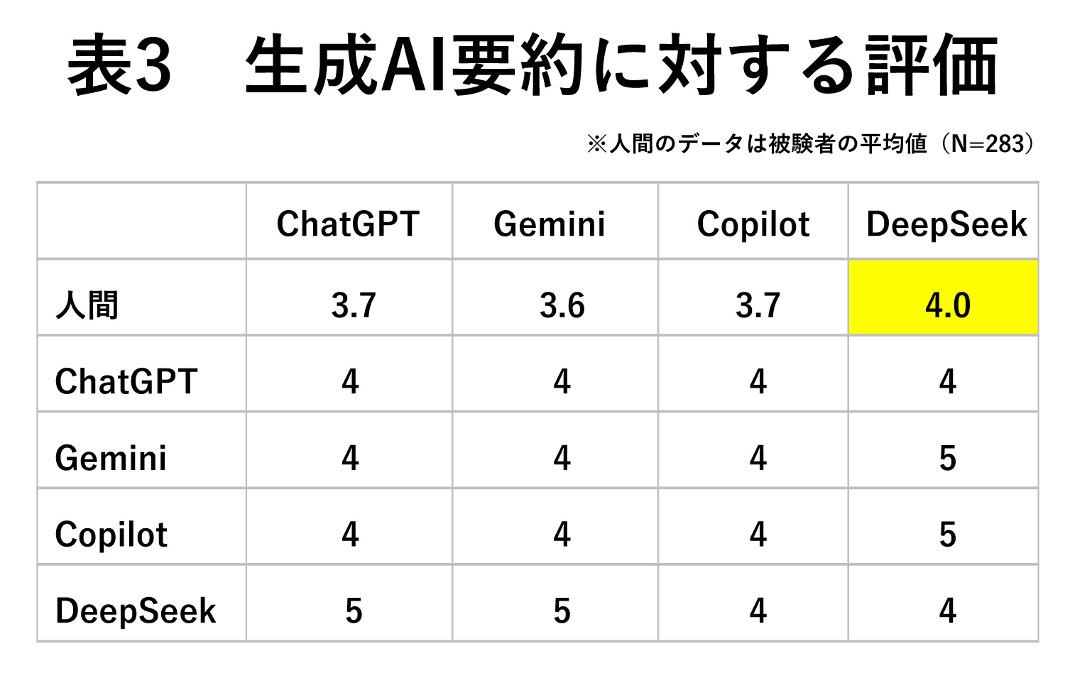 さらに今度は、どのAIによる要約かは教示せずに、「ある生成AIが出した要約です」としたグループを設け(人間のN=283。先の条件とは異なるサンプル)、その評価も記録した(表3)。こうすることで、ChatGPTやDeepSeekなどの固有名詞が「提示された場合(表2)」と「隠された場合(表3)」で、読み手が受ける印象がどう違うかを明らかにできる。