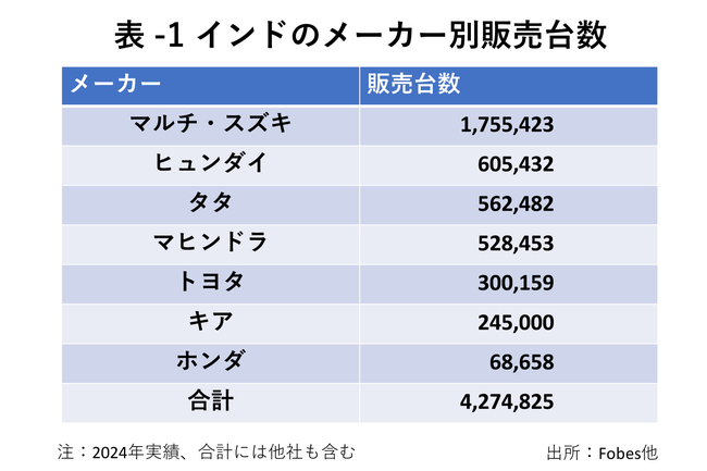 インドは、中国、米国、日本に次ぐ世界4位の自動車販売台数の国だ。24年の販売台数は428万台だが、ほぼ人口が同じ中国の3144万台とは、まだ大きな開きがある。昨年のメーカー別の販売台数1位は、日本のスズキの子会社マルチ・スズキ、2位は韓国ヒュンダイ、3位はインドの財閥タタと続く(表-1)。