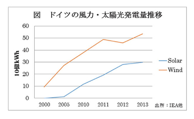 この制度により、再エネ設備を導入する投資家は20年間に亘り収益が保障されることとなり、一挙に設備導入が進むことになった。90年には風力と太陽光の設備量はほとんどなかったが、2000年末には風力610万kW、太陽光11万kW、10年末には風力2716万kW、太陽光1732万kW、13年末には風力3380万kW、太陽光3600万kWと急速に拡大した。合わせるとドイツの設備量の40%に達する。