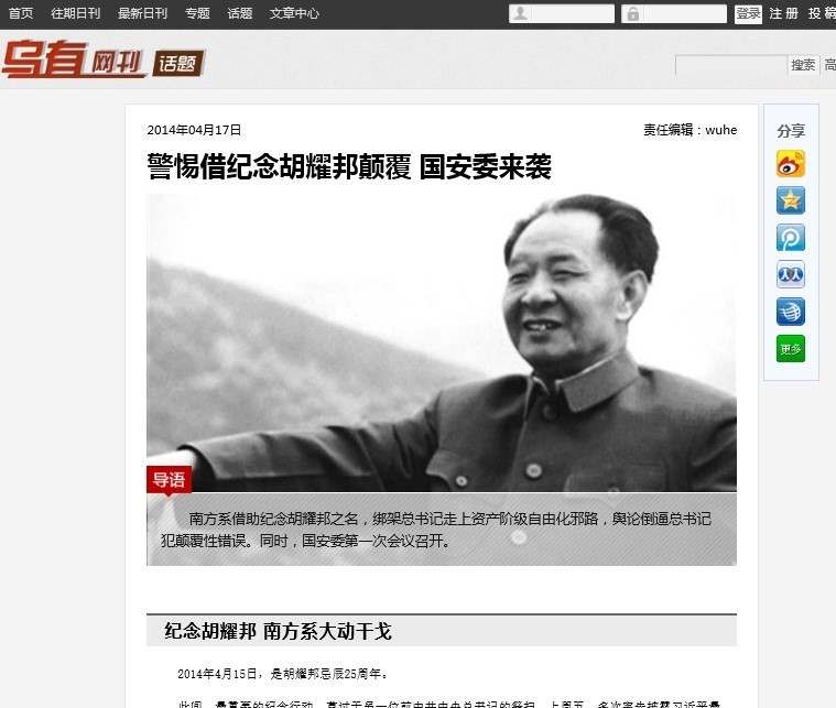今回、保守派の立場から胡耀邦追悼を警戒する論評を紹介したい。「鳥有網刊」サイトの論評「胡耀邦記念に便乗しての転覆を警戒せよ 国安委が襲来」という文章だ。同サイトは中国国内で保守グループが開設していた「鳥有之郷」サイトが基になっているが、言論の激しさと論争の大きさから当局によって一時閉鎖された経緯がある。そのサイトをリニューアルしたのがこの「鳥有網刊」である。一時期、ネット書店の形でほそぼそとサイトを開設していたが、その後、論評ページも開設され、毎日更新されている。