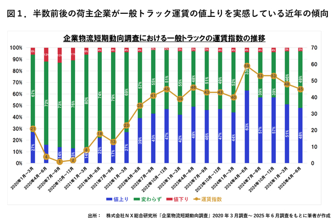 下の図1.は、過去3カ月間のトラック運賃が値上りしたのか、値下がりしたのか、現状維持だったのかを割合(%)で示し、値上りと回答した荷主企業の事業所の割合(%)と値下がりと回答した事業所の割合(%)を差し引きした一般トラック運賃指数の推移を、20年1~3月から25年4~6月までにわたって追ったグラフである。