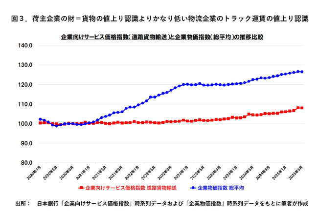 このグラフは、2つの指数ともに20年の平均値を100として、以降25年5月までの推移を示している。ご覧の通り、道路貨物輸送が過去5年強かけて100から110弱まで緩やかに増加してきたのに対し、企業物価指数は120台後半まで、より急激に増加している。