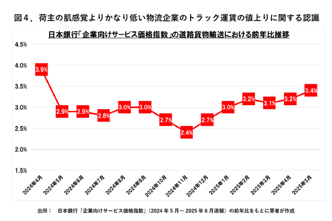 ご覧の通り、過去2年間の道路貨物輸送(トラック輸送)の企業向けサービス価格指数の前年同月比は、2%台後半から3%台を行き来しており、図2.で示した荷主企業の肌感覚よりは、かなり控えめであることが読み取れる。