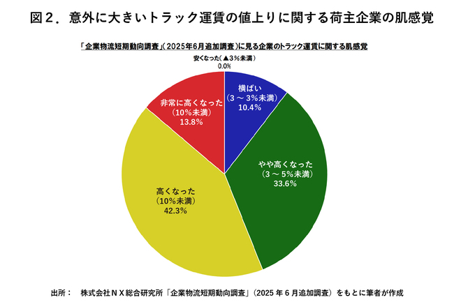 この追加調査の結果を見る限り、値下がりは1件もなく、横ばいも10%前後に留まっている。トラック運賃の値上りは、一桁台の後半から10%台以上のレベルを中心として、広範に行きわたっていることが推察される。トラック運賃に関する荷主企業の実感、肌感覚はそのようなものとなっている。