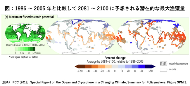 気候変動に関する政府間パネル(IPCC)の最新の第6次評価報告書で示された図によると、温室効果ガスの高排出が続くというシナリオの下では、日本の周辺の海域で海の動物の資源量が今世紀末に20~30%台の減少を示す朱色で塗られている。これは、高排出シナリオ下の世界全体海洋動物資源量減少率の約15%より大きい。IPCCの『海洋・雪氷圏特別報告書』によると、日本周辺の海域は、低緯度域ほどではないものの、相当程度の漁獲量の減少が予想されている。