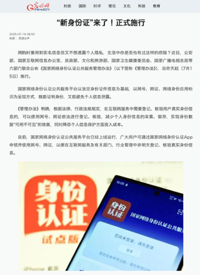 中国で7月15日から、インターネット上での身分が証明できる「国家ネットワーク身分認証公共サービス」が正式に始まった。中国共産党の公式機関紙の一つである「光明日報」が運営するニュースメディアGMW.cn(光明网、Guangming Online)では「ネットショピングで実名情報を使う必要があるのに、個人情報を漏らしたくない、そんな悩みを抱えていませんか? 先日、公安部、中国サイバースペース管理局、民政部、文化観光部、国家衛生健康委員会、国家ラジオテレビ総局など6つの部門が共同で『国家ネットワーク身分認証公共サービス管理弁法』を発表し、昨日(7月15日)から施行されました」と報じている。