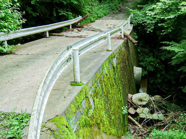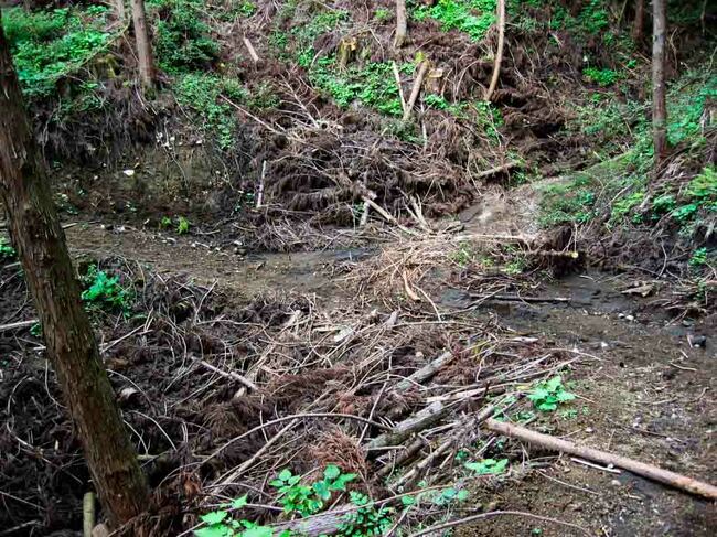 写真9は豪雨後の洗越であるが、増水した沢水が運んできた土砂や流木が溜まる。しかし、これを取り除けばすぐに通行可能になるし、路面が傷んでいればこの部分だけ補修すればいいのだ。このように軽微な被害は容認して、林道全線を守るという柔軟な発想が必要ではないか。