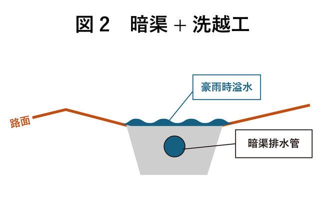 それならば、図2のように、暗渠の部分が低くなるように両側から路面に勾配をつけるのだ。こうすれば、仮に暗渠が詰まって、路上に沢水が溢れたとしてもそのまま路面を横断していく。