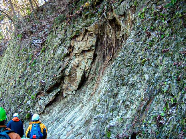 写真15を見てもらおう。一見して明らかに滑り落ちそうな岩盤である。これを流れ盤あるいは流れ目などと呼んでいるが、このような箇所で切土をすると、常に切土法面が滑落の危険にさらされる。
