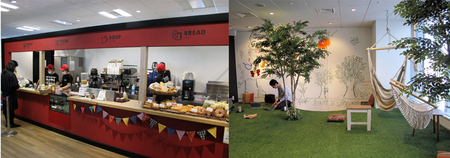 まずはカフェから見学させてもらった。東京ミッドタウンの10階にあるカフェ「CAMP10」。15階にあるカフェは「CAMP15」だという。2つのカフェのコンセプトは少し違う。「CAMP15」はインプット、「10」はリラックスに重点を置いたスペース。コーヒーの味も「15」では刺激が強い深煎り、「10」はリラックスできる風味なのだそう。カフェ内のスペースも、「15」はホワイトボードを使って簡単な企画会議などを行える「マッシュアップ」ゾーンが広く、「10」はくつろげる「リラックス」ゾーンが広い。芝生やハンモックのあるスペースもある。