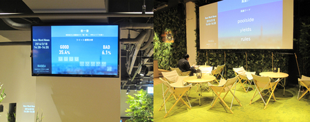また、食堂内には、背景にミッドタウンからの眺めが映るモニターが複数設置されていた。「窓がない食堂なので、せめて外を眺める雰囲気だけでも」という思いがあったといい、ミッドタウンからの眺めと一緒に表示されていたのは「今、一番検索されているキーワード」や「ツイート数が多いもの」、さらに「ツイートの感情分析」も。このときは「春一番」という言葉が1分あたり平均で8.9回ツイートされていたということがモニターから分かった。食堂内は窮屈な感じはしないが、照明の雰囲気などから、なんとなく外の世界から「守られている」スペースであるかのような独特の雰囲気がある。個人的な感覚だが、モニターに表示されるこの情報を見ていると、どこか別の世界から「今、世間で起こっていること」を眺めているような気がした。情報とは今いる場所とは違う場所の景色を見せるもの。そういう意味で、このモニターは本当に「窓」の役目を果たしている。