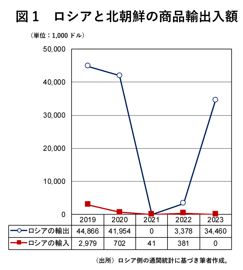そこで、ロシアの貿易統計集を改めて紐解き、北朝鮮との輸出入額を調べて、それをもとに図1を作成してみた。なお、ロシアの紙の貿易統計集は出るのが遅いので、現時点では2023年の数字までしか判明していない。