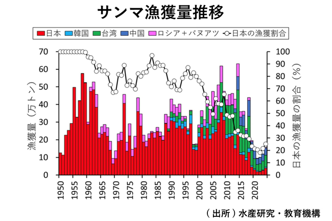 赤の棒グラフが日本で、20~30年前までは黒の折線グラフで示されている通り、サンマ全体の漁獲量の約8割も占めていました。今では2割程度に減っています。緑の台湾、そして青の中国の漁獲量が増えて21年には、漁獲量が3位となっています。