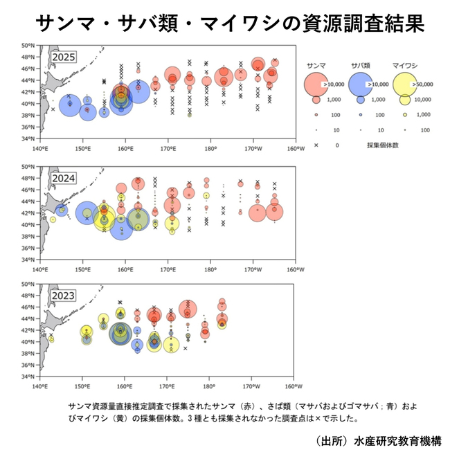 下図は、サンマ(赤)、サバ類(青)、マイワシ(黄)で、各魚種の資源量を円の大きさで示した調査結果です。赤のサンマについては低位のままで、昨年並みの漁獲量と予測されています。